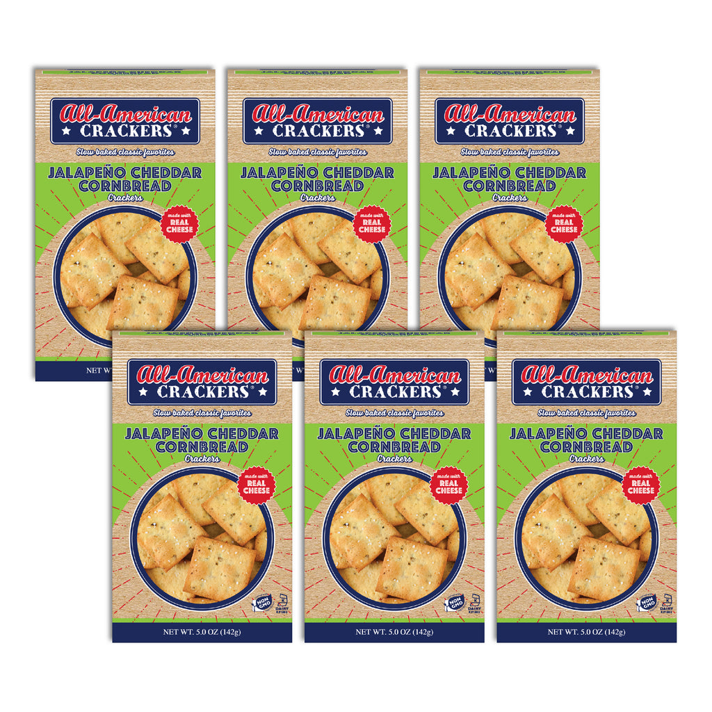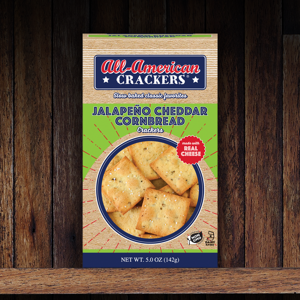 Slow baked classic favorites! If you enjoy a delicious cornbread with a kick, you'll love these spicy Jalapeño Cheddar Cornbread crackers. Made with real cheese and real butter, these crispy crackers are perfect for pairing with a smooth cream cheese or enjoying as a satisfying snack all on their own!