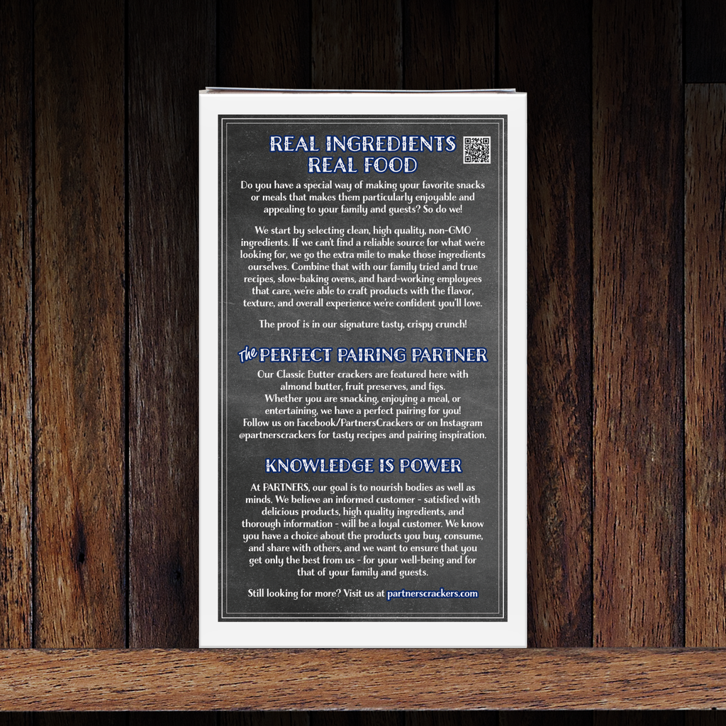 These light, crispy crackers are deliciously versatile. The perfect staple for your pantry, PARTNERS' classic, gourmet artisan crackers are slow baked with real butter and buttermilk. They are a tasty complement to soups and salads and are ideal for snacking on their own as a satisfying alternative to chips.