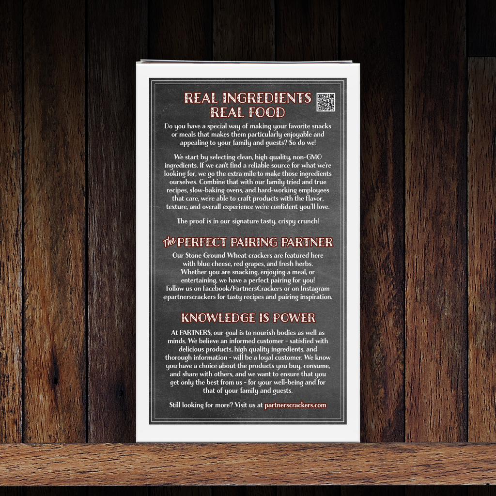 Slow baked to a hearty crisp with wholesome cracked wheat, Partners Stone Ground Wheat Crackers are the newest addition to the Partners snack cracker line. This spin on the classic wheat cracker offers up a satisfying crunch topped with the right amount of salt for enjoying on their own or creating elegant pairings for entertaining.